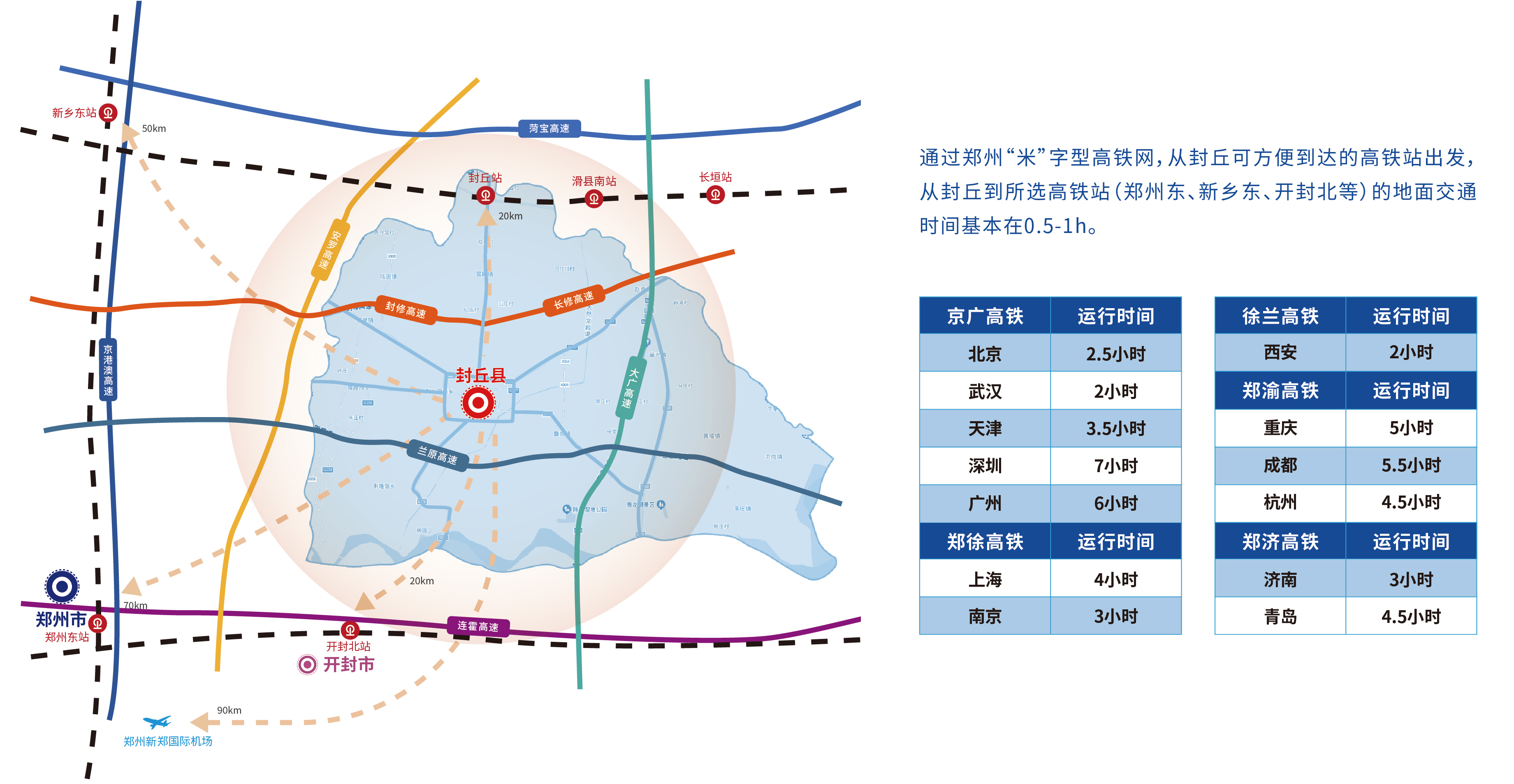 封丘地处中原之中,以县城为中心实现了“高速公路四面绕城,国道省道无缝衔接”的交通新格局,随着大广、兰原、长修、安罗四条高速以及国道230黄河大桥等建成通车,带动封丘融入郑州大都市区、郑汴新一体化城市群1小时通勤圈,辐射人口2亿人;封丘距离高铁开封北站20公里,新乡东站50公里,郑州东站70公里,郑州新郑国际机场90公里;8个小时可通达全国。